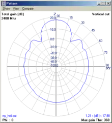 The output indicates that the antenna has a maximum gain of 9.75 dBi, a little over three times the gain of an isotropic antenna. However, as the signal moves even five degrees to the side, this has dropped to 9.5. When you reach 75 degrees off the front, the antenna begins to have negative gain. This indicates that this antenna is fairly directional, and one would expect it to have a high front-to-back ratio.[18]