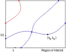 Another type of singular point is a turning point bifurcation, or saddle-node bifurcation, where the direction of the parameter reverses as the curve is followed. The red curve in the figure above illustrates a turning point.