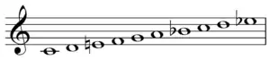 The Ukrainian Dorian mode (also known as Mi sheberach mode) is a combined scale built upon the seventh degree of the Ahavah Rabbah scale. It is also closely related to the Magein Avot mode, in that a pre-concluding phrase in Ukrainian Dorian can cadence on its supertonic, which is the 5th degree of the relative Magein Avot scale. This happens quite often in the nusach for the Three Festivals.[3] It is similar to the Arabic maqam Nikriz.