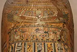 She was often painted on the inside lid of the sarcophagus, protecting the deceased. The vaults of tombs were often painted dark blue with many stars as a representation of Nut. The Book of the Dead says, "Hail, thou Sycamore Tree of the Goddess Nut! Give me of the water and of the air which is in thee. I embrace that throne which is in Unu, and I keep guard over the Egg of Nekek-ur. It flourisheth, and I flourish; it liveth, and I live; it snuffeth the air, and I snuff the air, I the Osiris Ani, whose word is truth, in peace.''