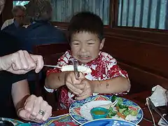 In the 17th century, screw nutcrackers were introduced that applied more gradual pressure to the shell, some like a vise.[1] The spring-jointed nutcracker was patented by Henry Quackenbush in 1913.[5] A ratchet design, similar to a car jack, that gradually increases pressure on the shell to avoid damaging the kernel inside is used by the Crackerjack, patented in 1947 by Cuthbert Leslie Rimes of Morley, Leeds and exhibited at the Festival of Britain.[6][7][8][9] Unshelled nuts are still popular in China, where a key device is inserted into the crack in walnuts, pecans, and macadamias and twisted to open the shell.[10]