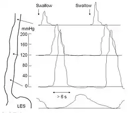 Nutcracker esophagus is characterized as a motility disorder of the esophagus, meaning that it is caused by abnormal movement, or peristalsis of the esophagus.[2] People with motility disorders present with two main symptoms: chest pain or difficulty with swallowing. Chest pain is the more common. The chest pain is very severe and intense, and mimics cardiac chest pain.[3][4][5][6] It may spread into the arm and back. The symptoms of nutcracker esophagus are intermittent, and may occur with or without food.[2] Rarely, patients can present with a sudden obstruction of the esophagus after eating food (termed a food bolus obstruction, or the 'steakhouse syndrome') requiring urgent treatment. The disorder does not progress to produce worsening symptoms or complications, unlike other motility disorders (such as achalasia) or anatomical abnormalities of the esophagus (such as peptic strictures or esophageal cancer). Many patients with nutcracker esophagus do not have any symptoms at all, as esophageal manometry studies done on patients without symptoms may show the same motility findings as nutcracker esophagus.[2] Nutcracker esophagus may also be associated with metabolic syndrome. The incidence of nutcracker esophagus in all patients is uncertain.[7][8]