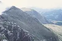 Most of Nyanga National Park is underlain by granite.[12] The highest mountains are composed of Umkondo Group dolerite and sandstone, with the harder dolerite forming cliffs and ridges[13] and the granite-dolerite contact often forming waterfalls.[14] The Troutbeck dolerite sill,[15] shown in the distance in the photograph of Kwaraguza above, was dated at 1099 Ma.[16]