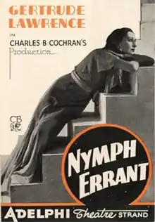 Nymph Errant had its tryout at the Opera House, Manchester, starting 11 September 1933. The musical opened in the West End at the Adelphi Theatre, London on 6 October 1933 and ran for 154 performances. Romney Brent directed and choreography was by Agnes de Mille. The cast featured Gertrude Lawrence as Evangeline Edwards, Elisabeth Welch as Haidee Robinson, Moya Nugent as Miss Pratt, and David Burns as Constantine.[4][5] The decor and costumes were designed by Doris Zinkeisen.[6][7]