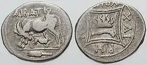 The fire sanctuary was associated with the cult of the nymphs.[9] A relief found near Byllis shows the nymphs and a cloth wrapped around the fire of the nymphaion.[11] A similar scene is also represented on a 1st-century BC silver coin of Apollonia that depicts three nymphs dancing around the fire of the nymphaion.[11][12] Of very ancient origin, the indigenous Illyrian cult of the nymphs influenced Apollonia.[13] The continuation of the cult of the nymphs in the Roman imperial period in Apollonia is testified in a 2nd-century AD Greek inscription reporting Illyrian names.[14]