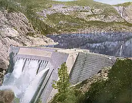 The concrete for the dam was processed in a plant located shortly upstream from the construction site, with sand and rock excavated from abundant alluvial deposits in the Hetch Hetchy valley.[36] This was mixed with cement shipped in on the Hetch Hetchy Railroad and local boulders ranging from 1 ft (0.30 m) to several yards (metres) in diameter to produce a cyclopean construction material for the dam.[36] Beginning in September 1921, the concrete was hoisted up a 375-foot (114 m) tower on the south side of the gorge, from which it could flow down movable chutes by gravity to the construction site. A total of 398,516 cu yd (304,687 m3) of concrete was poured to form a dam standing 226 feet (69 m) above the riverbed and 344 feet (105 m) above foundations.[36] The last concrete was placed in February 1922 and the dam was completed in May 1923. At the time, it was the second tallest dam in the United States, after Idaho's Arrowrock Dam. On May 24, 1923, the reservoir filled for the first time.[36] A peak labor force of five hundred worked on the project,[41] which claimed the lives of 67 men and one woman.[35]