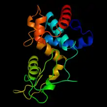 OBPgp279 (OBP genome protein 279) is an endolysin that hydrolyzes peptidoglycan, a major constituent in bacterial membrane.[1] OBPgp279 is found in Pseudomonas fluorescens phage OBP, which belongs in the Myoviridae family of bacteriophages. Because of its role in hydrolyzing the peptidoglycan layer, OBPgp279 is a key enzyme in the lytic cycle of the OBP bacteriophage; it allows the bacteriophage to lyse its host internally to escape. Unlike other endolysins, OBPgp279 does not rely on holins to perforate the inner bacterial membrane in order to reach the peptidoglycan layer.[1][2] Although OBPgp279 is not a well-studied enzyme, it has garnered interest as a potential antibacterial protein due to its activity against multidrug-resistant gram-negative bacteria.[3]