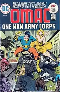 OMAC (Buddy Blank) is a fictional superhero created in 1974 by Jack Kirby and published by DC Comics.[1] The character was created towards the end of Kirby's contract with the publisher following the cancellation of his New Gods series; it was reportedly developed strictly due to Kirby needing to fill his contractual quota of 15 pages a week.[2][3] As envisioned by Kirby, OMAC is essentially Captain America set in the future, an idea Kirby had toyed with some years earlier while at Marvel Comics but had never realized.[3]