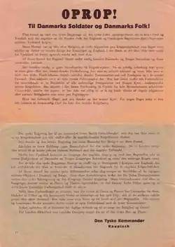 OPROP! (Opraab! in correct 1940-Danish; transl. proclamation) was a German airborne propaganda leaflet dropped over several Danish cities at the German invasion of Denmark on 9 April 1940. The leaflets were signed by the head of Operation Weserübung Süd, General Leonhard Kaupisch. The text, written in broken but understandable Danish mixed with Norwegian, justified the German invasion as fraternally protecting Danish and Norwegian neutrality against British aggression, denounced Winston Churchill as a warmonger, and exhorted the Danish populace not to resist the German presence while an arrangement with the Danish government was being negotiated.