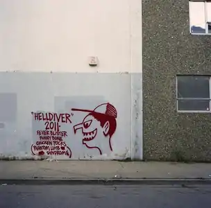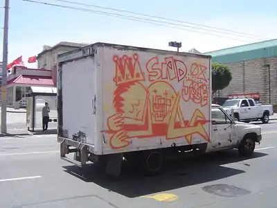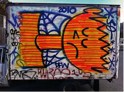 He was actively writing graffiti and making art in the Bay Area for over 25 years. ORFN used many alternate monikers, including Sad Jose, Helldiver, Muddguts, Chainsaw, Phantasmagoria, Hungry Waif, Vampire Wizard Zeus, and Very Viva Scout.[2] He gained notoriety for the number of San Francisco "bus flow" style tags he placed across the Bay Area, most of which were dated with the year in which they were done. However, his work evolved to include straightforward patterns and tone combinations that often featured smiling faces, sad children, cobwebs, skulls and other spooky imagery executed in a lo-fidelity, accessible, and playful manner. ORFN's work has drawn comparisons to that of Jean-Michel Basquiat. ORFN's work was very rarely included in formal displays.[1] ORFN was a member of a number of graffiti crews, including Under Shadows (US), Big Kid Fun (BKF), Down for Whatever (DFW), 640, and Big Time Mob (BTM).[3]