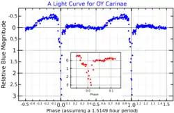 A blue band light curve for OY Carinae, adapted from Khruzina1 et al. (2003).[1] The main plot shows the full light curve, and the inset shows the minimum with an expanded horizontal scale.