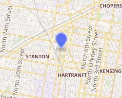 The 1882 Athletics played at the park, bounded by Huntingdon Street (north), 11th Street (east), Cumberland Street (south), and 12th Street (west) in the West Kensington neighborhood.[2] The Athletics played 39 regular-season games at the park, compiling a 21–18 record.[3] The franchise relocated to Jefferson Street Grounds in 1883.[4] Oakdale Park was sold shortly thereafter and torn down. Philadelphia Ball Park would be built a couple of blocks west of this site, five years later.