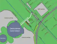The BART station is a three-level elevated station, with fare control and concessions located on the ground level east of San Leandro Street underneath the northern end of the platform.[21] Conventional BART trains serve an island platform between two tracks on the elevated second level. Union Pacific's grade-level Oakland Subdivision (which is proposed to be converted to a rail trail) parallels BART immediately to the east, separating the station from the adjacent Coliseum neighborhood.[22] A stairlift-equipped accessible pedestrian underpass tunnel runs underneath the Union Pacific right-of-way and connects the fare control area with the parking area and Snell Street.[21][23] A taxi stand is located along the western side of San Leandro Street just north of 71st Avenue, with a secondary taxi loading zone also located along the eastern side of Snell Street near the bicycle locker area.