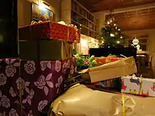 Traditionally, Armenians fast during the week leading up to Christmas avoiding all meat, eggs, and dairy products.[47] Devout Armenians may even refrain from food for the three days leading up to Christmas Eve, in order to receive the Eucharist on a "pure" stomach. Christmas Eve is particularly rich in traditions. Families gather for the Christmas Eve dinner (khetum, Խթում), which generally consists of rice, fish, nevik (նուիկ, a vegetable dish of green chard and chick peas), and yogurt/wheat soup (tanabur, թանապուր). Dessert includes dried fruits and nuts, including rojik, which consists of whole shelled walnuts threaded on a string and encased in grape jelly, bastukh (a paper-like confection of grape jelly, cornstarch, and flour), etc. This lighter menu is designed to ease the stomach off the week-long fast and prepare it for the rather more substantial Christmas Day dinner. Children take presents of fruits, nuts, and other candies to older relatives.[49] "On the eve of the Feast of the Nativity and Theophany of The Lord Jesus Christ, the Jrakalouyts Divine Liturgy (the lighting of the lamps service) is celebrated in honor of the manifestation of Jesus as the Son of God (theophany)"[50] In addition to the Christmas tree (tonatsar, Տօնածառ), Armenians (particularly in the Middle East) also erect the Nativity scene. Christmas in the Armenian tradition is a purely religious affair. Santa Claus does not visit the nice Armenian children on Christmas, but rather on New Year's Eve. The idea of Santa Claus existed before the Soviet Union and he was named kaghand papik (Կաղանդ Պապիկ), but the Soviet Union had a great impact even on Santa Claus. Now he goes by the more secular name of Grandfather Winter (dzmerr papik, Ձմեռ Պապիկ).
