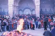 The Assyrians, the indigenous people of northwestern Iran, northern Iraq, northeastern Syria, and southeastern Turkey that belong to the Assyrian Church of the East, Ancient Church of the East, Syriac Orthodox Church, and Chaldean Catholic Church today celebrate Christmas on December 25. Assyrians colloquially call Christmas Eda Zora, meaning "little holiday." It is officially called Eda d'Yalde which means "birthday holiday." Traditionally, Assyrians fast (sawma) from December 1 until Christmas Day. In Iraq, for instance, on Christmas Eve, Assyrian families congregate outside of their house and hold lighted candles while a child reads aloud the nativity story. Then they all sing psalms over a bonfire made of thorn bushes. Folklore says that if the thorns burn to ashes, the family will have good luck. After the fire has been reduced to ashes, the family members will jump three times over the ashes and make a wish.[51] The next day, on Christmas, "as another bonfire burns in the churchyard, the bishops lead the service while carrying a figure of the baby Jesus. He blesses one person with a touch. That person touches the next person and the touch passes around until all have felt the touch of peace."[52] Many Assyrians will attend the Shaharta, or midnight vigil before Christmas. On Christmas Day, when families gather together after the Shaharta or morning mass, raza d'mowlada d'maran, the fast is broken by eating traditional Assyrian foods such as pacha/reesh-aqle (meaning "from the head to the tail"), which is a boiled soup made of sheep or cow intestines, tongue, stomach, legs, and spices or harissa, a porridge made of ground wheat and chicken (both dishes are prepared usually overnight). These two dishes are only made twice a year: on Christmas and Easter. Traditional desserts eaten after the main course include Killeche, a date and walnut-stuffed cookie, and Kadeh, another stuffed pastry. After the feast is finished, Assyrians will visit the houses of family and friends to exchange Christmas greetings, saying, "Eedokhon breekha," meaning "May your feast be blessed."[53] There, the host will serve tea, Turkish coffee, and Killeche and Kadeh to guests. Although Christmas is celebrated in a much more religious fashion, in recent years, families put up a small Christmas tree in the house.