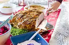 The Christmas meal is mince pies, turkey, gammon, beef tongue, turducken, corned beef, green salad, roast beef or a barbecue outdoors. The meal is finished with Christmas Pudding, Ice cream or trifle. Christmas crackers are used to make noise.[11]