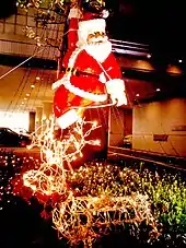 As in many East Asian countries, secular Christmas displays are common both in business establishments and in public, including lights, Christmas trees, depictions of Santa Claus despite the tropical climate, and Christmas greetings in various foreign languages and various Philippine languages. Occasionally such displays are left in place even in summer for example the parol representing the "Star of Bethlehem" which led the Three Kings to the newborn Baby Jesus.[44]