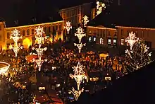 As only around 5% of the population are actually Christian, Christmas is not usually celebrated as a religious event in Taiwan.[26] Before 2001, the 25th of December used to be a national holiday, as that was the Constitution Day, on which date the Constitution of the Republic of China was signed in 1947.[27] In recent years, the secular celebration of Christmas is gaining popularity in Taiwan, where Christmas parties are held and gifts are sometimes exchanged. Major cities and shopping malls are now decorated with Christmas lights and trees in December to celebrate the festival.[28] One of the most popular Christmas events in Taiwan is Christmasland in New Taipei City organised by the New Taipei City Government, consisting of major Christmas celebration activities and art installations. A series of activities such as the family garden party, Christmas parade carnival and Christmas Eve concert are often held, despite the programme being slightly different from year to year.[29]