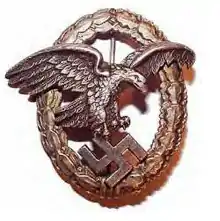The Observer's Badge (German: Beobachterabzeichen) was a German military decoration that was awarded before and during World War II to members of the German Air Force (Luftwaffe). They qualified for the badge after completing two months of qualifying service and five operational flights in the role of observer, navigator or bombardier; also, it could be awarded after a member of the German Air Force was wounded while acting in the capacity of an observer during a qualifying flight. It was worn on the left breast tunic pocket of an air force or political uniform tunic. A citation was issued with the awarded badge.[1] Thereafter, Luftwaffe service personnel who had already been awarded the Pilot's Badge and Observer's Badge could qualify for the Pilot/Observer Badge.[2][3] After 31 July 1944 the regulations were changed and the recipient had to have held both qualification certificates for at least one year to qualify for the Pilot/Observer Badge.[2]