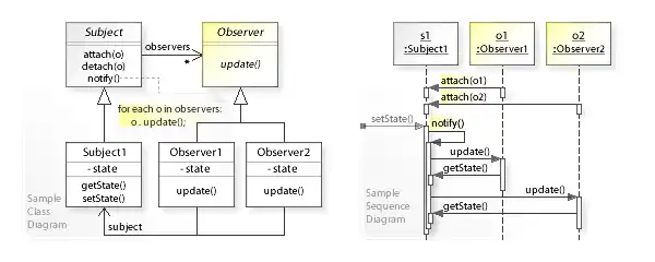 SubjectandObserverobjects. - so that when a subject changes state, all registered observers are notified and updated automatically (and probably asynchronously).