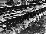 The guns were mounted on Batignolles style rail mounts which consisted of five steel cross ties with integral spades which were driven between the railroad ties. On top of these steel ties, two heavy girders were laid parallel to the tracks which bolted to the ties. The girders were equipped with 12 sets of flanges that matched the same number on the carriage. When the carriage was over the flanges the carriage was fastened to the girders and the ties. Once the platform was ready, the piece could be anchored in minutes and ready to fire. The ties and girders supported the weight of the carriage and absorbed the gun's recoil, the track did not have to be reinforced.[1] A pit was also dug under the gun's breech and lined with a steel box to allow the gun to recoil at high angles of elevation, which took about 3 hours. The Batignolles mounts also employed car-traverse which allowed for limited traverse by shifting the carriage on its bogies. When the United States entered the First World War a license to produce Berceau style rail mounts was negotiated with Batignolles and the carriage used by the 12-inch M1895 railway gun was similar.[1]