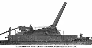 Each gun sat on a rectangular steel base which was suspended from two railroad bogies with four axles each. The number of axles was determined by the weight limit for European railways of 17 tonnes per axle and 17x8 = 136 tonnes.[1] The howitzers had a hydro-pneumatic cradle recoil system where the cradle recoiled up a slightly inclined rear deck which helped return the howitzer to battery after firing. The carriage used a car traversing mount so traverse was limited to a few degrees each side of the howitzers centerline. To load the gun the barrel was lowered to -6° and a loading ramp to the gun's breech could be erected.