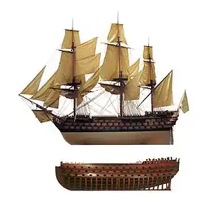 ![]() 1⁄48 scale model of the Océan-class 120-gun ship of the line Commerce de Marseille, on display at Marseille naval museum; and Half-hull of a 120-gun ship of the line on display at Brest naval museum. | |