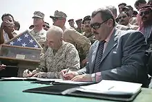 Maj. Gen. Thomas R. Turner II, commanding general, Task Force Band of Brothers stated at a ceremony marking the occasion "The turnover of Forward Operating Base Courage is one of the larger efforts towards empowering the Iraqi people and represents an important step in achieving Iraqi self-reliance ... The gains made during the past three years demonstrate that the provincial government, the Iraqi Army and the Iraqi Police are increasing their capabilities to take the lead for their nation's security." Duraid Mohammed Da'ud Abbodi Kashmoula, the Nineveh province governor, stated after being handed the key to the palace "Now this palace will be used to benefit the Iraqi government and its people."[34][35]