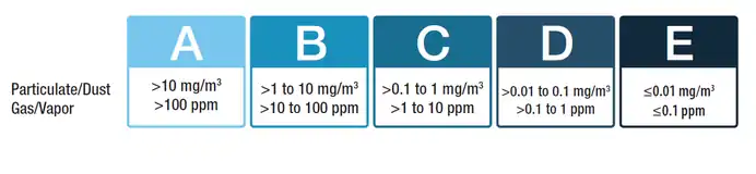 The process places chemicals into one of five bands, designated A through E. Each band is associated with a specific range of exposure concentrations. Band E represents the lowest range of exposure concentrations, while Band A represents the highest range. Assignment of a chemical to a band is based on both the potency of the chemical and the severity of the health effect. Band A and band B include chemicals with reversible health effects or produce adverse effects at only high concentration levels. Band C, band D, or band E include chemicals with serious or irreversible effects and those that cause problems at low concentration ranges.[1] The resulting airborne concentration target ranges are shown in the graphic:[6]