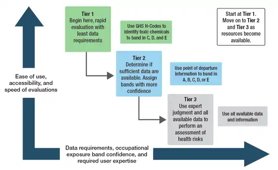 The NIOSH occupational exposure banding process utilizes a three-tiered approach.[1] Each tier of the process has different requirements for data sufficiency, which allows stakeholders to use the occupational exposure banding process in many different situations. Selection of the most appropriate tier for a specific banding situation depends on the quantity and quality of the available data and the training and expertise of the user.