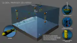 The Irminger Sea Array includes a set of four moorings. With a distance between moorings approximately ten times that of the water depth, the array is able to collect data on the mesoscale variability. One mooring site consists of a paired Global Surface and subsurface Global Hybrid Profiler mooring. The other two sites consist of subsurface Global Flanking Moorings. The water above the subsurface Global Hybrid Profiler Mooring is sampled by vertically profiling gliders. The water in and around the array is sampled by open-ocean gliders collecting data on spatial variability. Data from the gliders is transmitted wirelessly though an acoustic moden to the moorings and to a satellite for transmission to OOI's servers. Wireless reprogramming of the gliders and certain parts of the array is also possible to collect data on sudden events or environmental changes.[30]