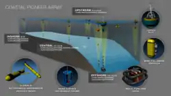 The Coastal Pioneer Array is a network of platforms and sensors that operate on the continental shelf and slope south of New England. A moored array is centered at the shelf break in the Mid-Atlantic Bight south of Cape Cod, Massachusetts. In 2024, the Coastal Pioneer Array will be relocated to the southern Mid-Atlantic Bight, between Cape Hatteras and Norfolk Canyon off the coast of North Carolina.[23]