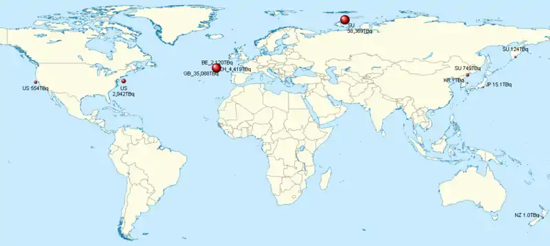 The countries involved – listed in order of total contributions measured in TBq (TBq=1012 becquerel) – were the Soviet Union, the United Kingdom, Switzerland, the United States, Belgium, France, the Netherlands, Japan, Sweden, Russia, New Zealand, Germany, Italy and South Korea. Together, they dumped a total of 85,100 TBq (85.1x1015 Bq) of radioactive waste at over 100 ocean sites, as measured in initial radioactivity at the time of dump.