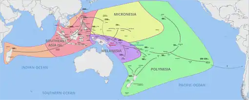 The Polynesian people are considered to be by linguistic, archaeological and human genetic ancestry a subset of the sea-migrating Austronesian people and tracing Polynesian languages places their prehistoric origins in the Malay Archipelago, and ultimately, in Taiwan. Between about 3000 and 1000 BC, speakers of Austronesian languages began spreading from Taiwan into Island South-East Asia,[124][125][126] as tribes whose natives were thought to have arrived through South China about 8,000 years ago to the edges of western Micronesia and on into Melanesia.