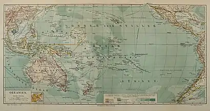 The Journal of the Royal Statistical Society stated in 1892 that Australia was a large island within Oceania rather than a small continent. It additionally commented, "it is certainly not necessary to consider the Hawaiian Islands and Australia as being in the same part of the world, it is however permissible to unite in one group all the islands which are scattered over the great ocean. It should be remarked that if we take the Malay Archipelago away from Oceania, as do generally the German geographers, the insular world contained in the great ocean is cut in two, and the least populated of the five parts of the world is diminished in order to increase the number of inhabitants of the most densely populated continent."[64] Regarding Australia and the Pacific, Chambers's New Handy Volume American Encyclopædia observed in 1885 that, "the whole region has sometimes been called Oceania, and sometimes Australasia—generally, however, in modern times, to the exclusion of the islands in the [Malay] Archipelago, to which certain writers have given the name of Malaysia."[65] It added that there was controversy over the exact limits of Oceania, and that, "scarcely any two geographers appear to be quite agreed upon the subject; neither shall we pretend to decide in the matter."[65]