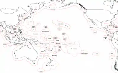 The linked map below shows the exclusive economic zones (EEZs) of the islands of Oceania and neighbouring areas, as a guide to the following table (there are few land boundaries that can be drawn on a map of the Pacific at this scale).