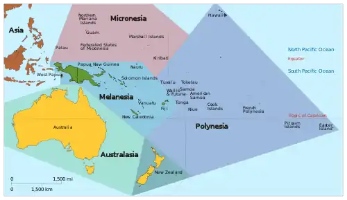 Depending on the definition, New Zealand could be part of Polynesia, or part of Australasia with Australia.[95] New Zealand was originally settled by the Polynesian Māoris, and has long maintained a political influence over the subregion.[96][97] Through immigration and high Māori birth rates, New Zealand has attained the largest population of Polynesians in the world,[98] while Australia has the third largest Polynesian population (consisting entirely of immigrants). Modern-day Indigenous Australians are loosely related to Melanesians,[99][100] and Australia maintains political influence over Melanesia,[97] which is mostly located on the same tectonic plate.[41][42] Despite this, Australia is rarely seen as a part of the subregion.[101][102] As with Australia and New Zealand, Melanesia's New Caledonia has a significant non-indigenous European population, numbering around 71,000.[103] Conversely, New Caledonia has still had a similar history to the rest of Melanesia, and their French-speaking Europeans make up only 27% of the total population.[103][89] As such, it is not also culturally considered a part of the predominantly English-speaking Australasia.[104] Some cultural and political definitions of Australasia include most or all of Melanesia, due to its geographical proximity to Australia and New Zealand, but these are rare.[105] Australia, New Zealand and the islands of Melanesia are more commonly grouped together as part of the Australasian biogeographical realm.[106] The Bonin Islands are in the same biogeographical realm as the geographically adjacent Micronesia, and are sometimes grouped in with the subregion because of this.[107][108]