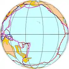 The Pacific Plate, which makes up most of Oceania, is an oceanic tectonic plate that lies beneath the Pacific Ocean. At 103 million square kilometres (40,000,000 sq mi), it is the largest tectonic plate. The plate contains an interior hot spot forming the Hawaiian Islands.[162] It is almost entirely oceanic crust.[163] The oldest member disappearing by way of the plate tectonics cycle is early-Cretaceous (145 to 137 million years ago).[164]