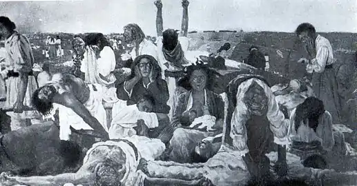 In 1907, following the crushing of the Romanian Peasants' Revolt, Băncilă began traveling the country and attempting to gather evidence of government repression and violence. The result was a series of twelve paintings (not all of them surviving), including his famous figure of an old peasant standing open-armed (titled Înainte de 1907, "Before 1907"), several images of dead bodies piled up in fields (being looked on by soldiers), and the eponymous 1907, depicting three ragged peasants running into rifle fire.[6]