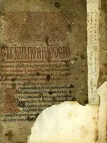 Though the name of the book "Oktoich" derived from the Greek name Octoechos (Old Slavonic "Osmoglasnik," because "glas" is the Slavonic term for echos), the Slavic book did rather correspond to the unnotated Tropologion, and often it included the hymns of the Irmolog as well.[23] The Slavic reception, although it can be regarded as faithful translation of the Byzantine books, is mainly based on early Theta notation, which was used by Slavic reformers in order to develop own forms of notation in Moscow and Novgorod (znamenny chant).[24] The translation activities between 1062 and 1074 at the Kievan Pechersk Lavra had been realised without the help of South Slavic translators.[25] The earliest known Slavonic manuscripts with neumes date from the late 11th or 12th century (mainly Stichirar, Kondakar and Irmolog). Concerning the earlier translations of the hymns and later translations in Russia, we can observe two different approaches to translation, one which favours the musical and metrical structure and another which favours the literal translation of the hymns. The school represented by Kliment of Ohrid, Naum, or Constantine of Preslav endeavoured to match the Greek text in the number of syllables in the hymns and to preserve the verse structure indicated by the corresponding neumes, but the resulting meaning of the hymns could change so considerably that, in certain cases, the only aspect the original and the translation had in common was the prescribed music, i.e., the indicated melos and echos. On the other hand, the later translations during the missions in Russia had their emphasis on a literal translation of the texts, but this resulted in altering the metrical structure given by the avtomela and the heirmoi so much that the music had to be recomposed.[26]