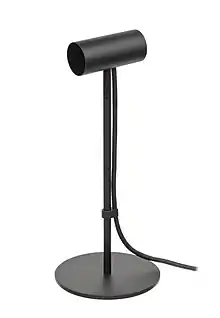 The Rift, or any other device being tracked by the system, is fitted with a series of precisely positioned infrared LEDs under or above the surface, set to blink in a specific pattern. By knowing the configuration of the LEDs on the objects and their pattern, the system can determine the precise position of the device with sub-millimeter accuracy and near-zero latency.[22] The system then includes one or more USB stationary infrared sensors that originally come with a stand in a desk lamp form factor, but standard screw holes allow for the stand to be removed and the sensor to be mounted anywhere the user sees fit. The sensors normally sit on the user's desk, creating a 3D space that allows the user to use the device while sitting, standing, walking, or even jumping around the room.[23]