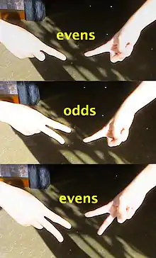 In Odds and Evens, however, individuals prepare by deciding who will be assigned odds and who will be evens. Then, one or both people say "One, two, three, shoot!" or "once, twice, three, shoot!"[6] As the word "shoot" is said, the two people quickly and simultaneously thrust a fist into the center, extending either an index finger, or both the middle and index finger, indicating one or two. The sum total of fingers displayed is either odd or even. If the result is odd, then the person who called odds is the victor, and can decide the issue as they see fit.[7][8][9] Often, the participants continue to shoot for a best two out of three.[10]