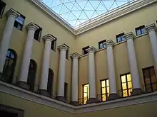 The Odeon was built in 1826–1828 on a commission from King Ludwig I of Bavaria and was originally a concert hall and ballroom. Klenze designed the exterior as an identical counterpart to that of the Palais Leuchtenberg, so that there was no outward indication of its function.[1] The auditorium, which measured 75 by 125 feet (23 by 38 m) and seated 1,445, had two superimposed colonnades which provided access on the ground floor and a gallery with standing room, and a ceiling 50 feet (15 m) high with a skylight.[1][2] The orchestra was accommodated in a semi-circular exedra, behind which in niches were busts by Johannes Leeb of the ten composers then considered most important in the history of music: Beethoven, Mozart, Gluck, Handel, Haydn, Vogler, Méhul, Weber, Cimarosa and Winter.[2] The ceiling was decorated with frescoes in the Nazarene style: Apollo among the Muses by Wilhelm Kaulbach, Apollo among the Herdsmen by Adam Eberle and The Judgement of Midas by Hermann Anschütz.[2][3] The hall, which has been called "one of the most extraordinary classical architectural solutions of the concert hall",[4] had excellent acoustics and was popular with the public.[1]