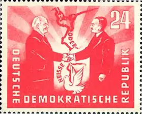 The East German Socialist Unity Party (SED), founded 1946, originally rejected the Oder–Neisse line.[54] Under Soviet occupation and heavy pressure by Moscow, the official phrase Friedensgrenze (border of peace) was promulgated in March–April 1947 at the Moscow Foreign Ministers Conference. The German Democratic Republic and Poland's Communist government signed the Treaty of Zgorzelec in 1950 recognizing the Oder–Neisse line, officially designated by the Communists as the "Border of Peace and Friendship".[55][56][57]