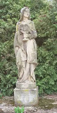 As the patroness of ocular afflictions and ear diseases, St. Odile is often depicted with a pair of eyes on a book - particularly fine examples of such images can be found from the 14th-16th centuries.[4] A notable sculpture of her exists at the Bavarian National Museum in Munich, which portrays the event of her baptism. The larkspur is connected to St. Odile as well and is believed to cure eye diseases in popular medicine and superstition.