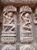 According to Kapila Vatsyayan, the Kalpasutra of Jainism, in its manuscripts discovered in Gujarat, includes classical Indian dance poses – such as the Samapada, the Tribhangi and the Chuaka of Odissi. This, states Vatsyayan, suggests that Odissi was admired or at least well known in distant parts of India, far from Odisha in the medieval era, to be included in the margins of an important Jain text.[39] However, the Jain manuscripts use the dance poses as decorative art in the margins and cover, but do not describe or discuss the dance. Hindu dance texts such as the Abhinaya Chandrika and Abhinaya Darpana provide a detailed description of the movements of the feet, hands, the standing postures, the movement and the dance repertoire.[40] It includes illustrations of the Karanãs mentioned in NãtyaShãstra.[41] Similarly, the illustrated Hindu text on temple architecture from Odisha, the Shilpaprakãsha, deals with Odia architecture and sculpture, and includes Odissi postures.[42]
