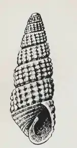 The elongate-conic shell is milk-white. It measures 4.3 mm. The whorls of the protoconch number at least two, and are small, smooth, and obliquely half immersed in the first of the succeeding turns. The seven and one-half whorls of the teleoconch are well rounded, moderately contracted at the suture, and well shouldered at the summit. They are marked by strong, very retractive axial ribs, of which 14 occur upon the first, 16 upon the second, 18 upon the third to fifth, and 22 upon the penultimate whorl. In addition to these ribs the whorls are marked by four strong spiral cords between the sutures which render their junction with the ribs tuberculate. The spaces enclosed by the ribs and cords form oval pits, the long axis of which coincides with the spiral sculpture. The sutures are channeled. The periphery of the body whorl are marked by a moderately broad groove, which is crossed by the continuation of the axial ribs which terminate at the posterior edge of the first basal keel. The base of the body whorl is well rounded, marked by six spiral keels which grow successively weaker from the periphery to the umbilical region. The broad spaces between these keels are crossed by slender, raised axial threads. The aperture is oval. The posterior angle is obtuse. The outer lip is thin, showing the external sculpture within. The columella is stout, curved, strongly reflected and reinforced by the base, provided with a strong fold at its insertion.[4]