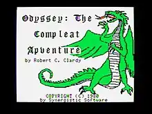 Odyssey: The Compleat Apventure was a videogame written by Robert Clardy and released by Synergistic Software in 1980. It was created for the Apple II platform and is considered one of the first microcomputer-based role-playing video games. The title was intentionally misspelled; Apventure is a reference to the Apple computer while "Compleat" is simply an Archaic spelling of the word "complete" meant to match the feel and setting of the game.