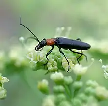 The family Oedemeridae is a cosmopolitan group of beetles commonly known as false blister beetles, though some recent authors have coined the name pollen-feeding beetles. There are some 100 genera and 1,500 species in the family,[1] mostly associated with rotting wood as larvae, though adults are quite common on flowers. The family was erected by Pierre André Latreille in 1810.