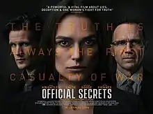 Official Secrets is a 2019 British drama film based on the case of whistleblower Katharine Gun, who leaked a memo exposing an illegal spying operation by American and British intelligence services to gauge sentiment of and potentially blackmail United Nations diplomats tasked to vote on a resolution regarding the 2003 invasion of Iraq.[3][4] The film is directed by Gavin Hood, and Gun is portrayed by Keira Knightley. The film also stars Matt Smith, Matthew Goode, Adam Bakri, Indira Varma, and Ralph Fiennes.